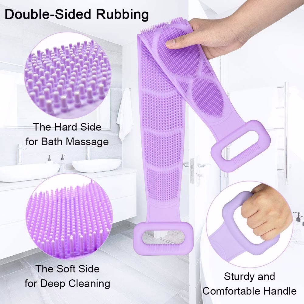 The soft silicone material gently exfoliates and massages your skin. With the two large-grip handles, the 31.5′ length, and the elasticity you can easily reach around your entire body. Fold it up and use it to scrub smaller areas.